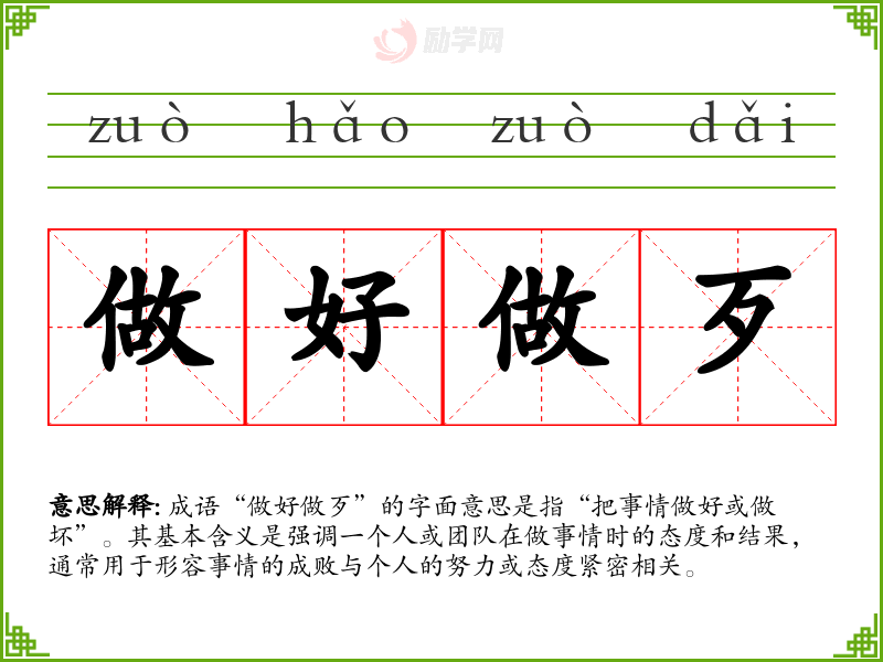 成语“做好做歹”的字面意思是指“把事情做好或做坏”。其基本含义是强调一个人或团队在做事情时的态度和结果,通常用于形容事情的成败与个人的努力或态度紧密相关。