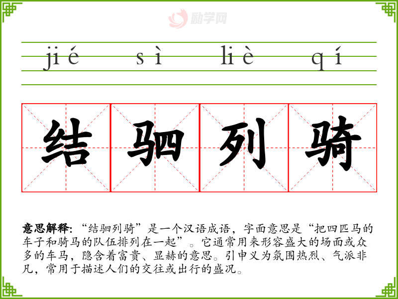 “结驷列骑”出自《左传》,原文是“结驷而列,驷马不相逢”,描述的是古代贵族出行时的情景。古代的驷马车是非常豪华的交通工具,只有地位显赫的人才能拥有,因此这个成语自然带有了显赫、尊贵的色彩。