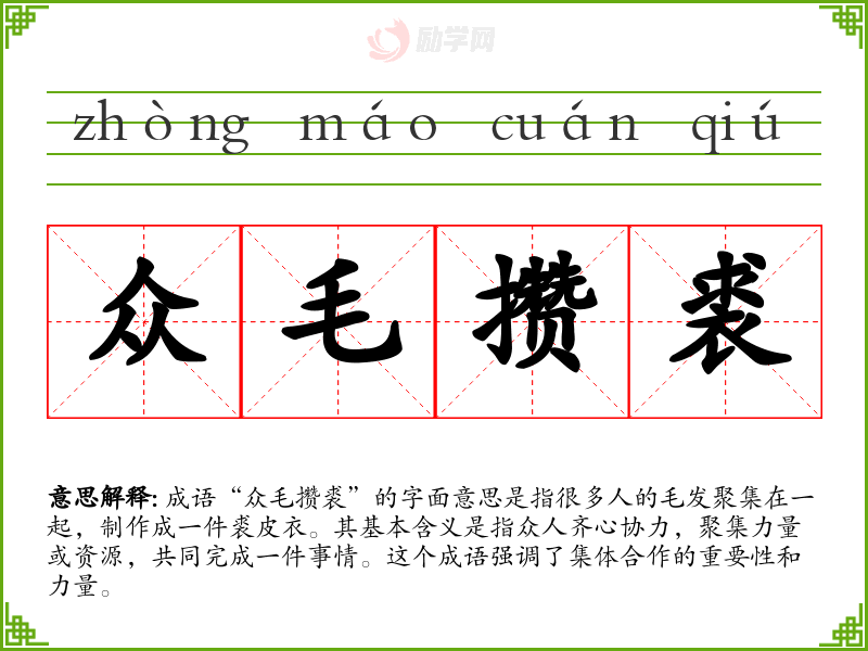 成语“众毛攒裘”的字面意思是指很多人的毛发聚集在一起,制作成一件裘皮衣。其基本含义是指众人齐心协力,聚集力量或资源,共同完成一件事情。这个成语强调了集体合作的重要性和力量。