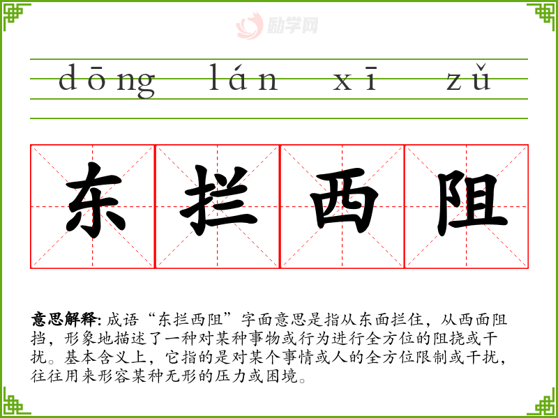 通过对“东拦西阻”的学,我加深了对成语的理解,认识到它在表达复杂情绪和困境中的独特作用。对我来说,这不仅是语言学的一部分,也是一种思维的拓展,时常提醒我在面对困难时保持坚定和灵活。
