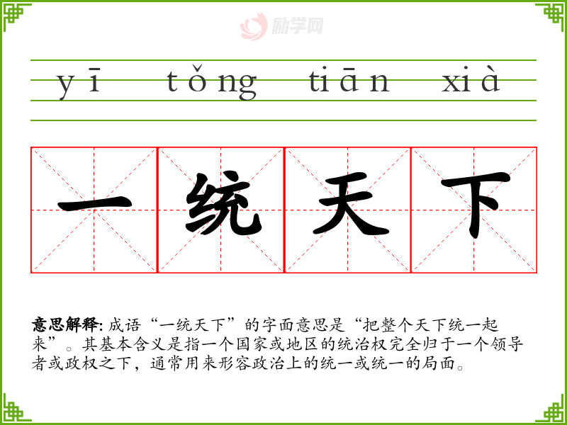 成语“一统天下”的字面意思是“把整个天下统一起来”。其基本含义是指一个国家或地区的统治权完全归于一个领导者或政权之下,通常用来形容政治上的统一或统一的局面。