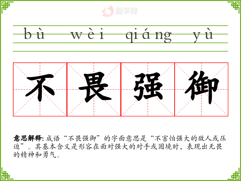 成语“不畏强御”的字面意思是“不害怕强大的敌人或压迫”。其基本含义是形容在面对强大的对手或困境时,表现出无畏的精神和勇气。
