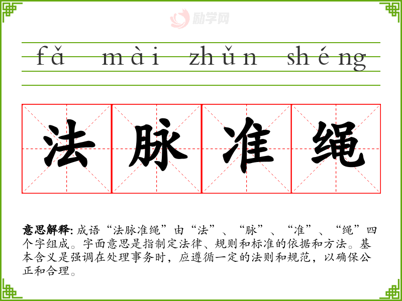 成语“法脉准绳”由“法”、“脉”、“准”、“绳”四个字组成。字面意思是指制定法律、规则和标准的依据和方法。基本含义是强调在处理事务时,应遵循一定的法则和规范,以确保公正和合理。