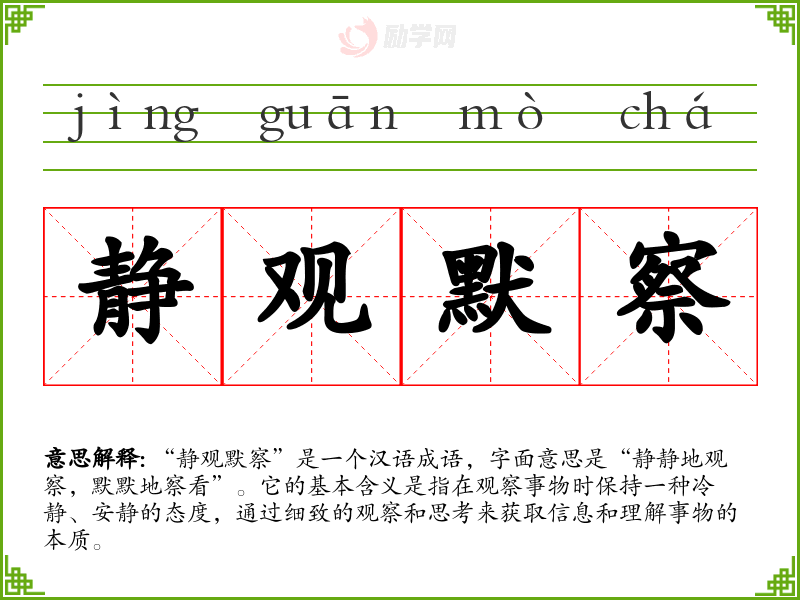 通过对“静观默察”的学,我认识到在快速变化的社会中,保持冷静和观察的重要性。这不仅有助于个人决策,也有助于更好地理解他人和环境。这个成语提醒我在生活和交流中,要时刻保持思考的惯,以便更好地应对各种挑战和变化。