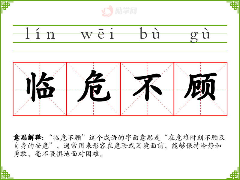“临危不顾”这个成语的字面意思是“在危难时刻不顾及自身的安危”,通常用来形容在危险或困境面前,能够保持冷静和勇敢,毫不畏惧地面对困难。