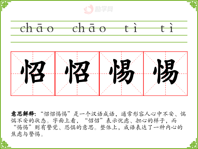 总的来说,“怊怊惕惕”这一成语不仅丰富了汉语的表达,也反映了人类共同的心理体验。理解并灵活使用这个成语,对提升语言表达能力和情感表达能力都有重要意义。通过学*这样的成语,我们能够更好地理解自己和他人的情感状态,从而在交流中更加得心应手。