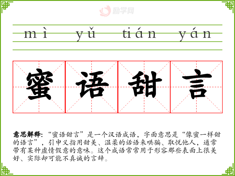 “蜜语甜言”是一个汉语成语,字面意思是“像蜜一样甜的语言”,引申义指用甜美、温柔的话语来哄骗、取悦他人,通常带有某种虚情假意的意味。这个成语常常用于形容那些表面上很美好、实际却可能不真诚的言辞。