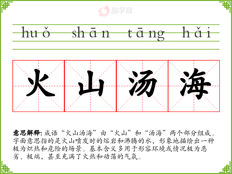 成语“火山汤海”由“火山”和“汤海”两个部分组成。字面意思指的是火山喷发时的熔岩和沸腾的水,形象地描绘出一种极为炽热和危险的场景。基本含义多用于形容环境或情况极为恶劣、极端,甚至充满了火热和动荡的气氛。