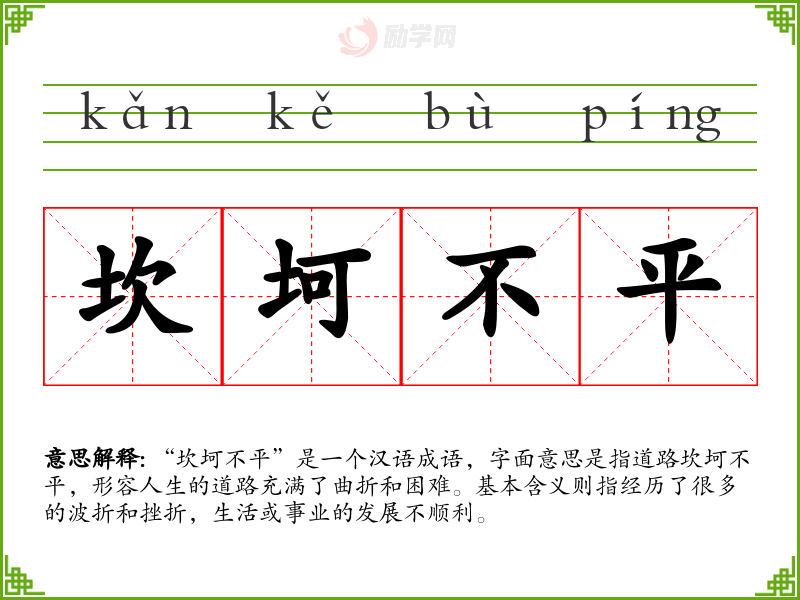 通过对“坎坷不平”的学,我深刻理解了生活中面对困难的重要性。这不仅是对个体心理素质的考验,也是对我们成长与成就的推动力。在语言学和表达中,能够灵活运用这样的成语,不仅丰富了语言表达,也加强了情感的传递。
