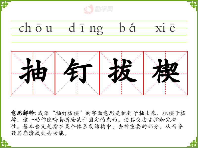 成语“抽钉拔楔”的字面意思是把钉子抽出来,把楔子拔掉。这一动作隐喻着拆除某种固定的东西,使其失去支撑和完整性。基本含义是指在某个体系或结构中,去掉重要的部分,从而导致其崩溃或失去功能。