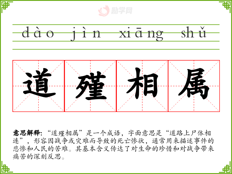 - 反义成语:生机盎然、繁荣昌盛。它们描述的是生机勃勃、幸福美好的状态,与“道殣相属”的悲惨景象形成鲜明对比。