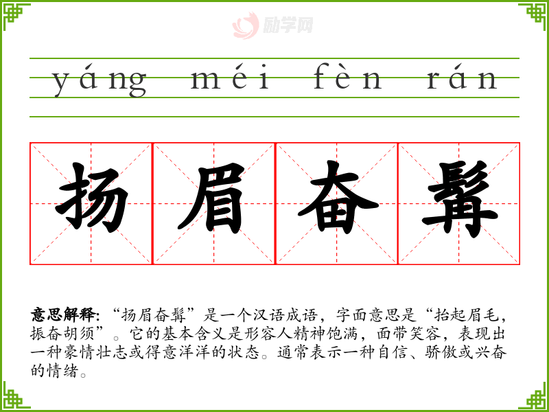 通过对“扬眉奋髯”的学,我认识到这个成语不仅仅是一个词汇,它蕴含了丰富的文化内涵和情感表达。在语言学中,掌握这样的成语能够提升表达的生动性和深度,帮助我更好地传递情感和态度。它提醒我在面对挑战时要保持自信,勇敢迎接未来。