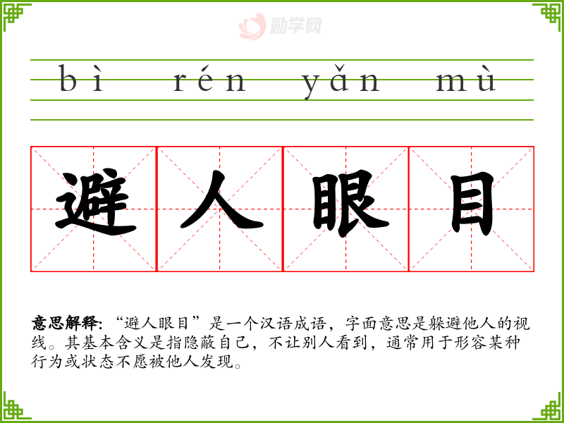 “避人眼目”是一个汉语成语,字面意思是躲避他人的视线。其基本含义是指隐蔽自己,不让别人看到,通常用于形容某种行为或状态不愿被他人发现。