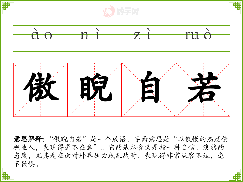 通过对“傲睨自若”的学,我认识到在生活中保持一种自信的态度是多么重要。无论是在学、工作还是人际关系中,这种从容不迫的表现都能带来积极的影响,帮助我更好地应对挑战。