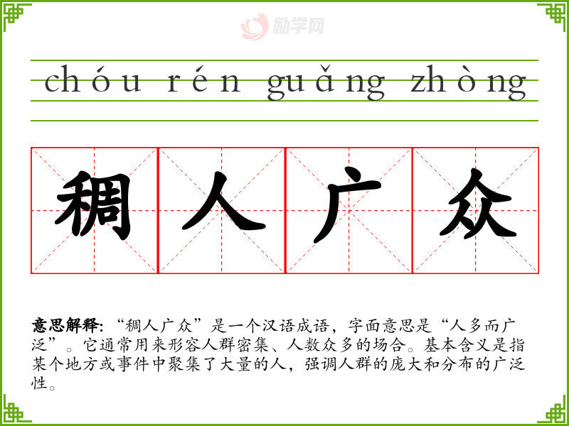 “稠人广众”是一个汉语成语,字面意思是“人多而广泛”。它通常用来形容人群密集、人数众多的场合。基本含义是指某个地方或**中聚集了大量的人,强调人群的庞大和分布的广泛性。