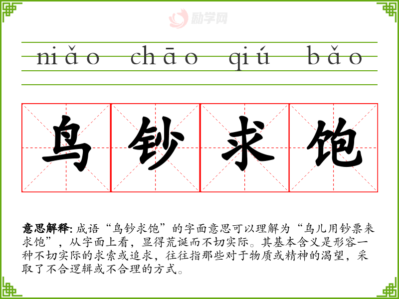 成语“鸟钞求饱”的字面意思可以理解为“鸟儿用钞票来求饱”,从字面上看,显得荒诞而不切实际。其基本含义是形容一种不切实际的求索或追求,往往指那些对于物质或精神的渴望,采取了不合逻辑或不合理的方式。