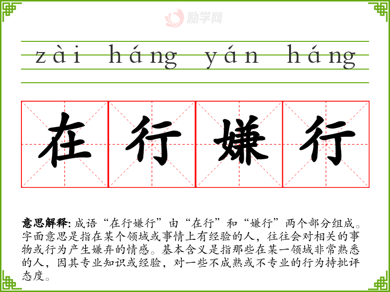 通过对“在行嫌行”的学,我认识到在任何领域内,专业知识的重要性以及对不专业行为的批评。这不仅仅是对行业的要求,也是提升自我素养的重要一环。在我的语言学和表达中,这一成语提醒我要时刻关注自己的专业性和对他人的批评,促使我不断进步。