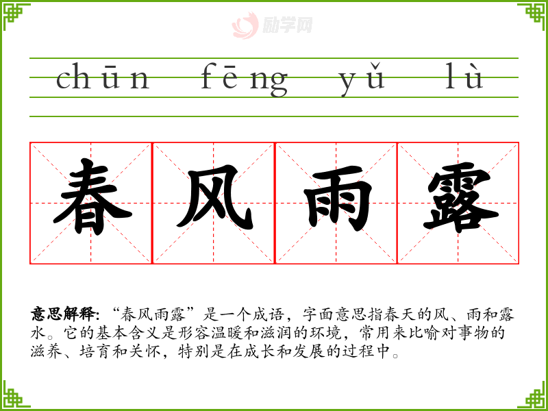 “春风雨露”是一个成语,字面意思指春天的风、雨和露水。它的基本含义是形容温暖和滋润的环境,常用来比喻对事物的滋养、培育和关怀,特别是在成长和发展的过程中。