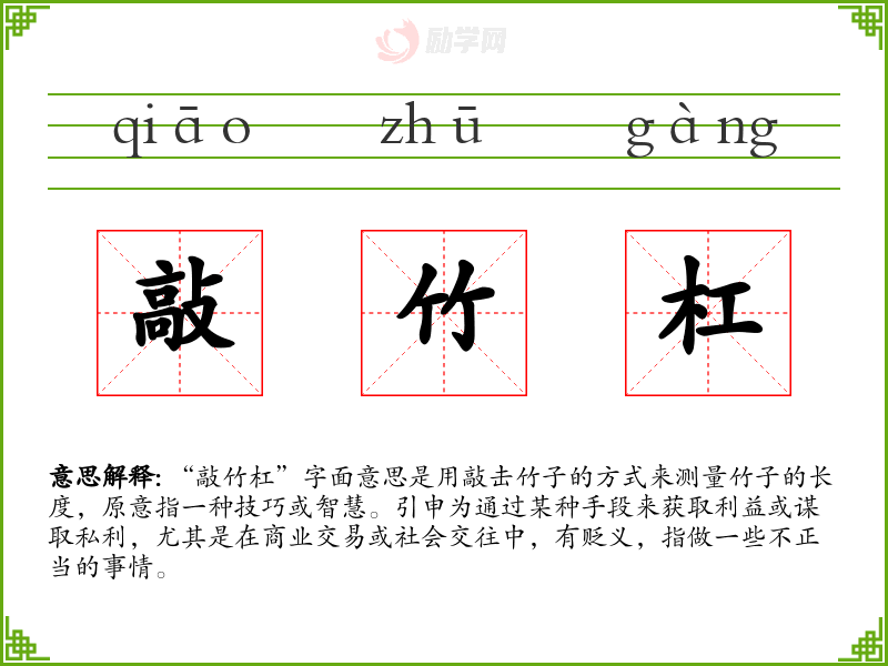 “敲竹杠”字面意思是用敲击竹子的方式来测量竹子的长度,原意指一种技巧或智慧。引申为通过某种手段来获取利益或谋取私利,尤其是在商业交易或社会交往中,有贬义,指做一些不正当的事情。