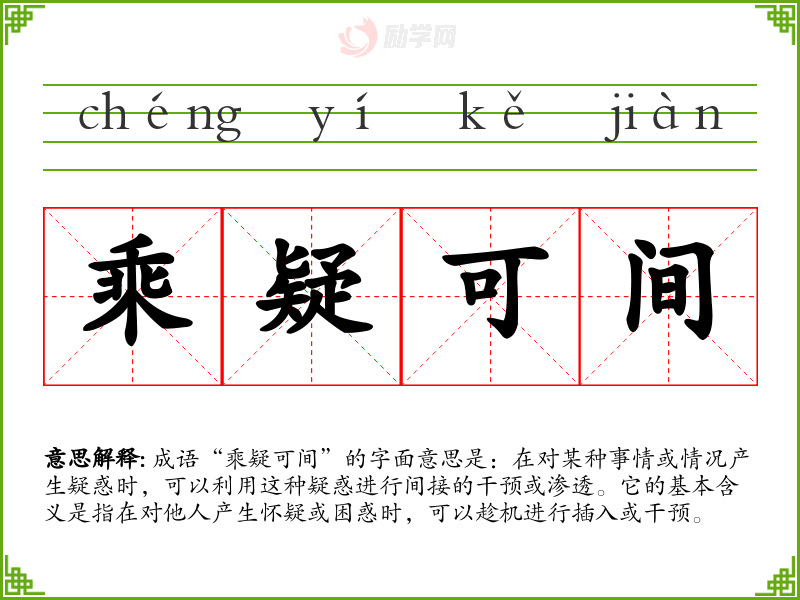 成语“乘疑可间”的字面意思是:在对某种事情或情况产生疑惑时,可以利用这种疑惑进行间接的干预或渗透。它的基本含义是指在对他人产生怀疑或困惑时,可以趁机进行插入或干预。