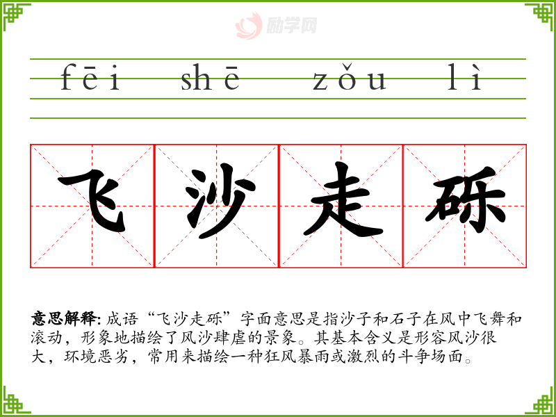 成语“飞沙走砾”字面意思是指沙子和石子在风中飞舞和滚动,形象地描绘了风沙肆虐的景象。其基本含义是形容风沙很大,环境恶劣,常用来描绘一种狂风暴雨或激烈的斗争场面。