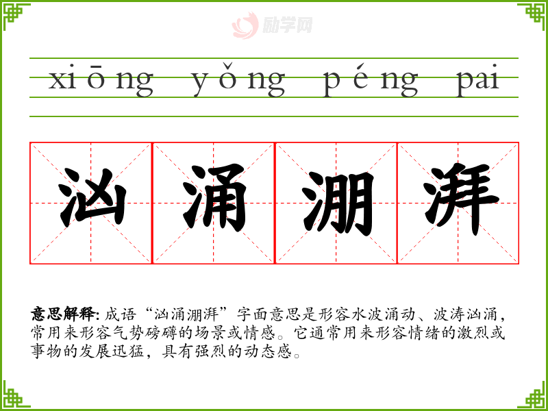 成语“汹涌淜湃”字面意思是形容水波涌动、波涛汹涌,常用来形容气势磅礴的场景或情感。它通常用来形容情绪的激烈或事物的发展迅猛,具有强烈的动态感。