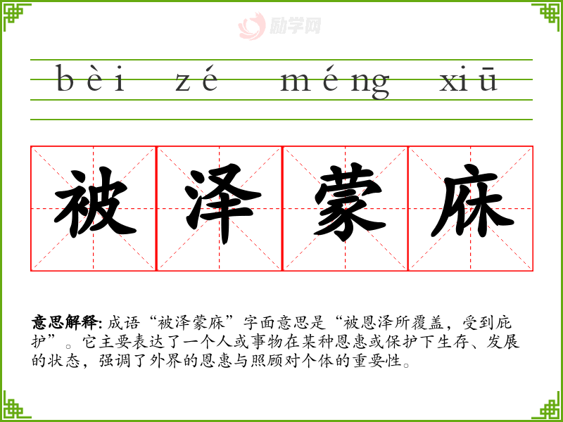成语“被泽蒙庥”字面意思是“被恩泽所覆盖,受到庇护”。它主要表达了一个人或事物在某种恩惠或保护下生存、发展的状态,强调了外界的恩惠与照顾对个体的重要性。