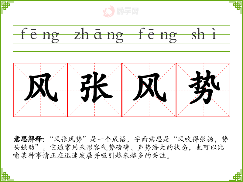 通过对“风张风势”的学,我深刻理解到它不仅仅是一个成语,更是一种精神与态度。在语言学和表达中,能够准确运用这样的成语,不仅可以丰富我的表达方式,还能提高我对语言细腻之处的感知和理解。