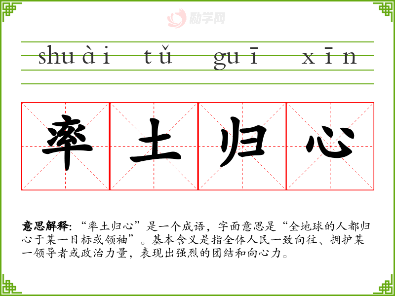 “率土归心”是一个成语,字面意思是“全地球的人都归心于某一目标或领袖”。基本含义是指全体人民一致向往、拥护某一领导者或政治力量,表现出强烈的团结和向心力。
