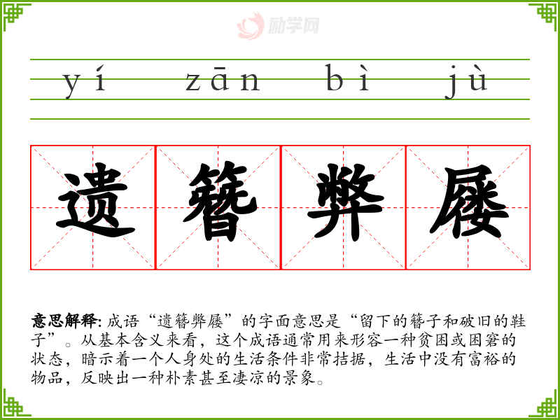 成语“遗簪弊屦”的字面意思是“留下的簪子和破旧的鞋子”。从基本含义来看,这个成语通常用来形容一种贫困或困窘的状态,暗示着一个人身处的生活条件非常拮据,生活中没有富裕的物品,反映出一种朴素甚至凄凉的景象。