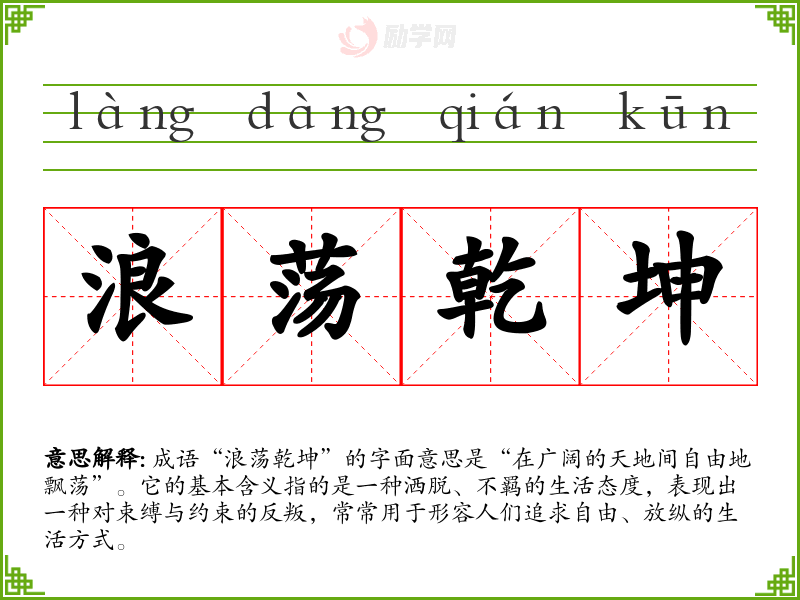 通过对“浪荡乾坤”的学,我更加理解了追求自由的价值以及在现代社会中如何保持这种精神。在语言学和表达中,这个成语提供了一个生动的例子,展示了文化背景如何影响语言的使用,也让我反思自己的生活方式和对自由的渴望。