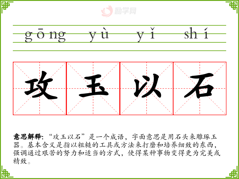 - 日常对话:在朋友之间鼓励对方时,“其实每个人都要经历攻玉以石的过程,才能取得成功。”