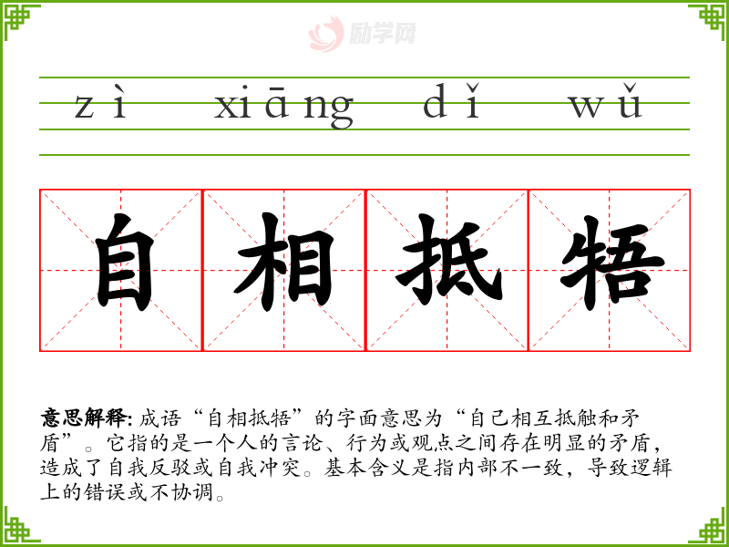通过对“自相抵牾”的学,我深刻认识到逻辑与表达的严谨性在沟通中的重要性。它不仅是语言学中的一部分,更是我们在生活中思考与交流时不可忽视的原则。理解并运用这一成语,能够帮助我在表达中更清晰、准确地传达思想。
