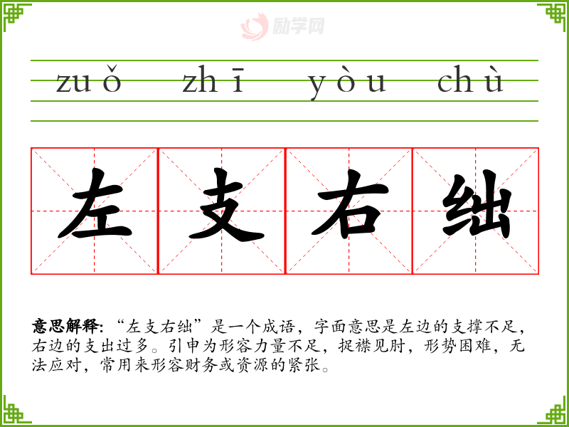 “左支右绌”是一个成语,字面意思是左边的支撑不足,右边的支出过多。引申为形容力量不足,捉襟见肘,形势困难,无法应对,常用来形容财务或资源的紧张。
