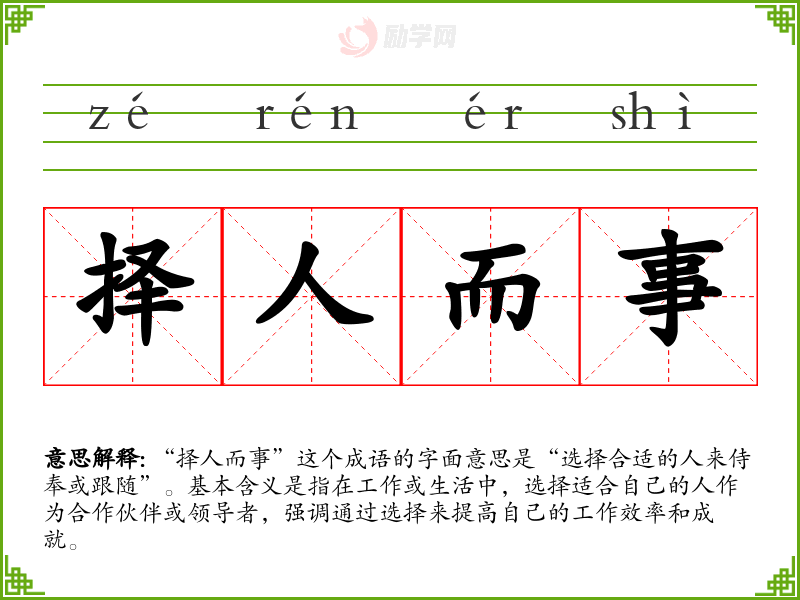 “择人而事”这个成语的字面意思是“选择合适的人来侍奉或跟随”。基本含义是指在工作或生活中,选择适合自己的人作为合作伙伴或领导者,强调通过选择来提高自己的工作效率和成就。