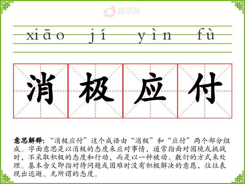 “消极应付”这个成语让我联想到一种无奈与逃避,可能在某些情况下选择这样的态度是因为压力过大或缺乏信心。它也让我意识到,面对困难时,积极的态度往往能带来更好的解决方案。