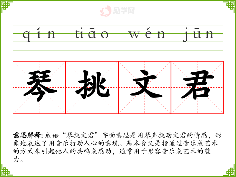 “琴挑文君”源于古代文学典故,特别是与著名的音乐家和文人之间的感情故事有关。文君是指古代著名的才女,她与音乐的关系密切,尤其是与琴声的互动。此成语常常与古代的爱情故事结合,强调音乐在情感交流中的重要性。