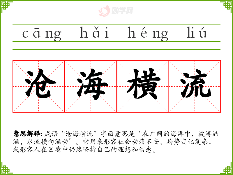通过对“沧海横流”的学*,我更加理解了在生活中面对变化和挑战时,保持坚定信念的重要性。这不仅丰富了我的语言表达方式,也让我在思维上有了更深层次的反思,激励我在未来的路上勇敢前行。