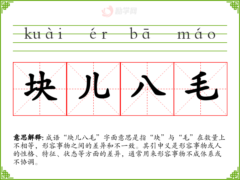 成语“块儿八毛”字面意思是指“块”与“毛”在数量上不相等,形容事物之间的差异和不一致。其引申义是形容事物或人的性格、特征、状态等方面的差异,通常用来形容事物不成体系或不协调。