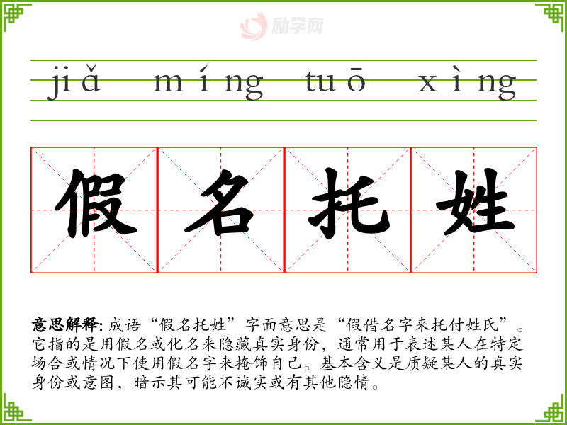 成语“假名托姓”字面意思是“假借名字来托付姓氏”。它指的是用假名或化名来隐藏真实身份,通常用于表述某人在特定场合或情况下使用假名字来掩饰自己。基本含义是质疑某人的真实身份或意图,暗示其可能不诚实或有其他隐情。