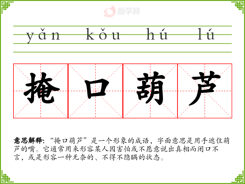 - 反义成语:畅所欲言、直言不讳。与“掩口葫芦”形成鲜明对比,表示人们自由地表达自己的想法和意见。