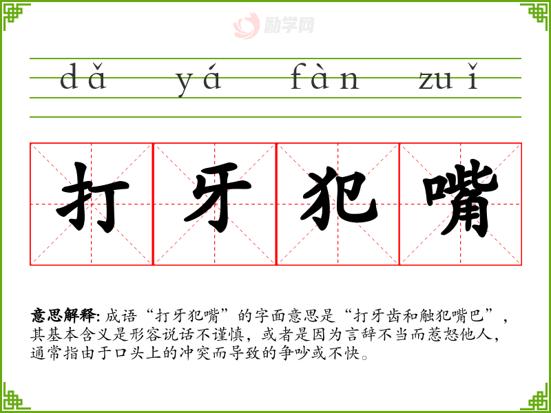 成语“打牙犯嘴”的字面意思是“打牙齿和触犯嘴巴”,其基本含义是形容说话不谨慎,或者是因为言辞不当而惹怒他人,通常指由于口头上的冲突而导致的争吵或不快。