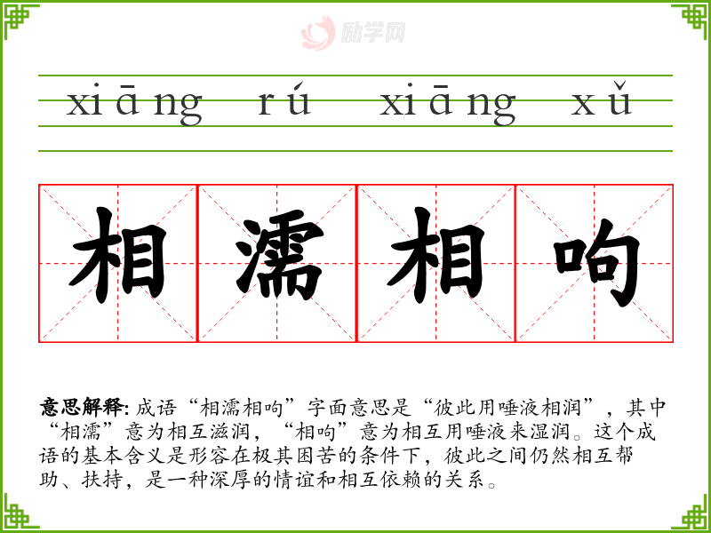 通过对“相濡相呴”的学*,我更加理解到了人际关系中的相互支持和关爱的重要性。这不仅丰富了我的词汇,也让我在生活中更加注重与他人之间的联系与合作。
