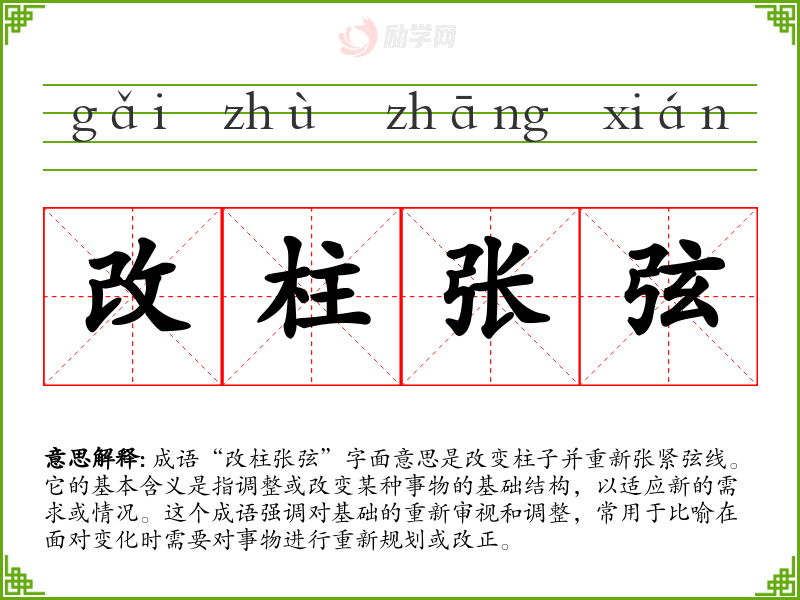 通过对“改柱张弦”的学,我认识到它在语言学和表达中的重要性。这个成语不仅是对变革的一种描述,更是对灵活应对生活变化的鼓励。它提醒我在生活中要保持开放的心态,勇于调整和改进,以适应不断变化的环境。