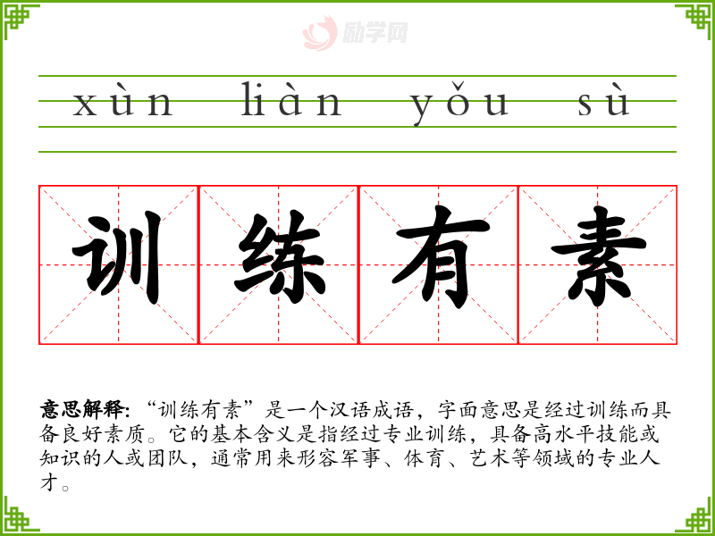 “训练有素”是一个汉语成语,字面意思是经过训练而具备良好素质。它的基本含义是指经过专业训练,具备高水平技能或知识的人或团队,通常用来形容军事、体育、艺术等领域的专业人才。