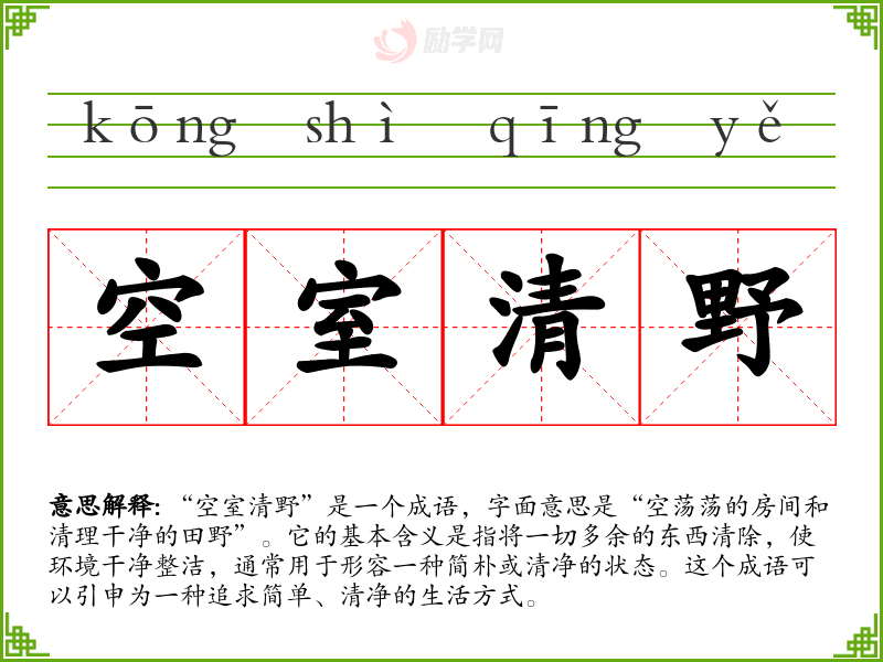 “空室清野”是一个成语,字面意思是“空荡荡的房间和清理干净的田野”。它的基本含义是指将一切多余的东西清除,使环境干净整洁,通常用于形容一种简朴或清净的状态。这个成语可以引申为一种追求简单、清净的生活方式。