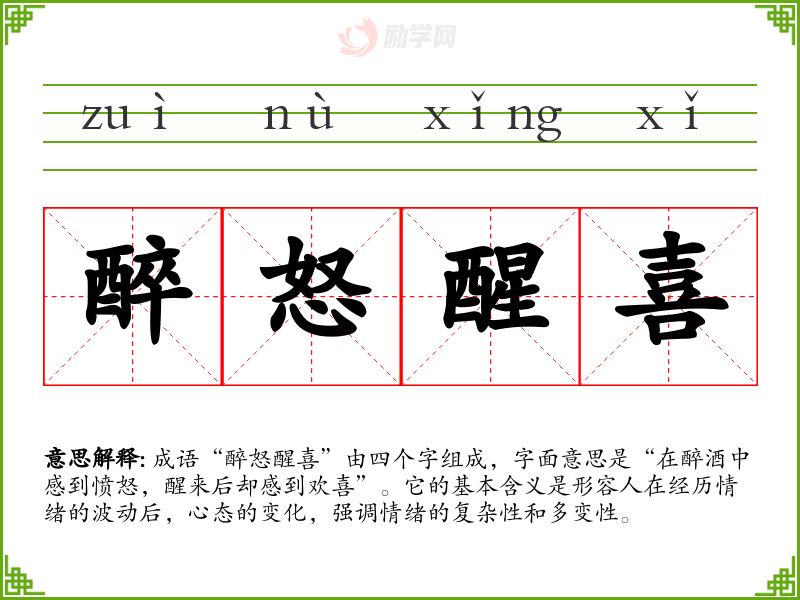 “醉怒醒喜”不仅是一个成语,更是一种生活哲学的体现,提醒我们在面对情感波动时,要学会从愤怒和失落中走出来,迎接新的希望。它的学*和运用不仅丰富了我的语言表达,也让我更加理解情感管理的重要性。