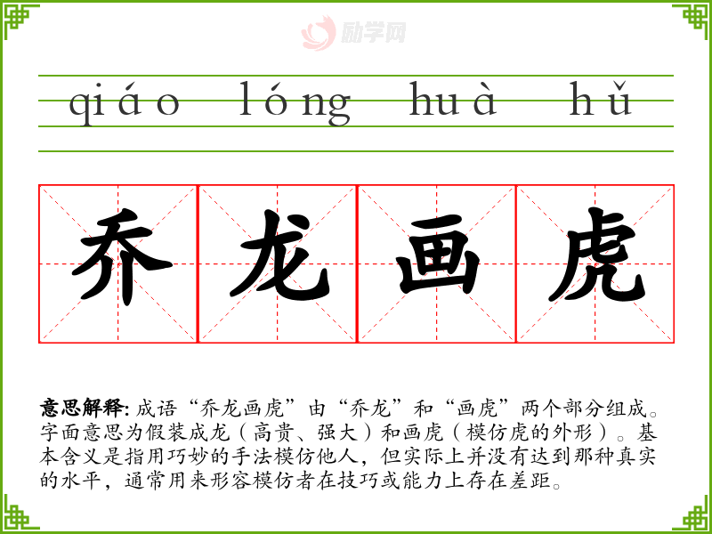 成语“乔龙画虎”由“乔龙”和“画虎”两个部分组成。字面意思为假装成龙(高贵、强大)和画虎(模仿虎的外形)。基本含义是指用巧妙的手法模仿他人,但实际上并没有达到那种真实的水平,通常用来形容模仿者在技巧或能力上存在差距。