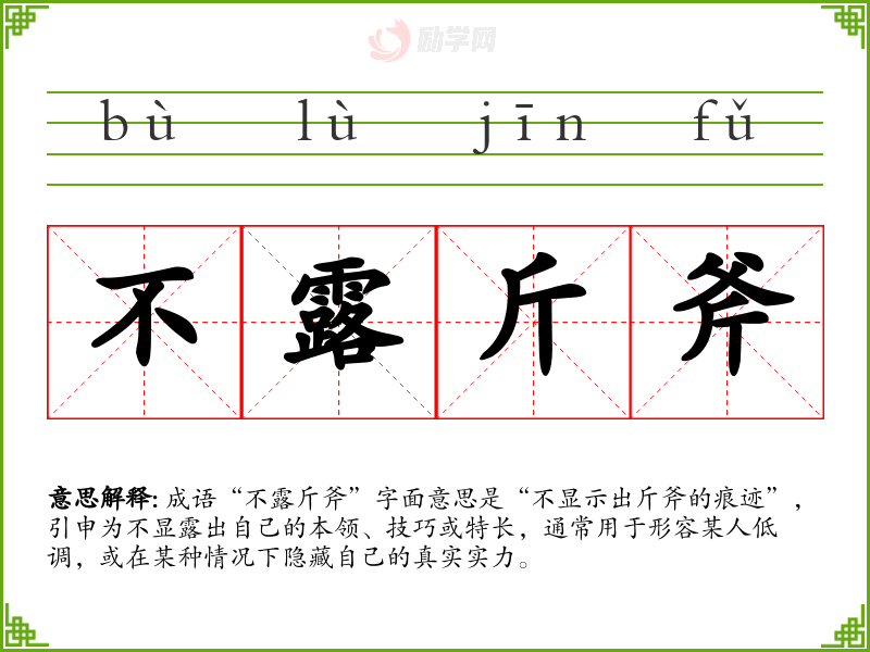 成语“不露斤斧”字面意思是“不显示出斤斧的痕迹”,引申为不显露出自己的本领、技巧或特长,通常用于形容某人低调,或在某种情况下隐藏自己的真实实力。