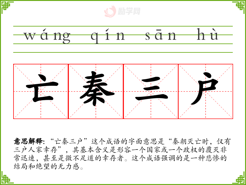 “亡秦三户”这个成语的字面意思是“秦朝灭亡时,仅有三户人家幸存”,其基本含义是形容一个国家或一个政权的覆灭非常迅速,甚至是微不足道的幸存者。这个成语强调的是一种悲惨的结局和绝望的无力感。